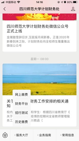 2.点击“服务大厅”上拉菜单中“网上缴费”。